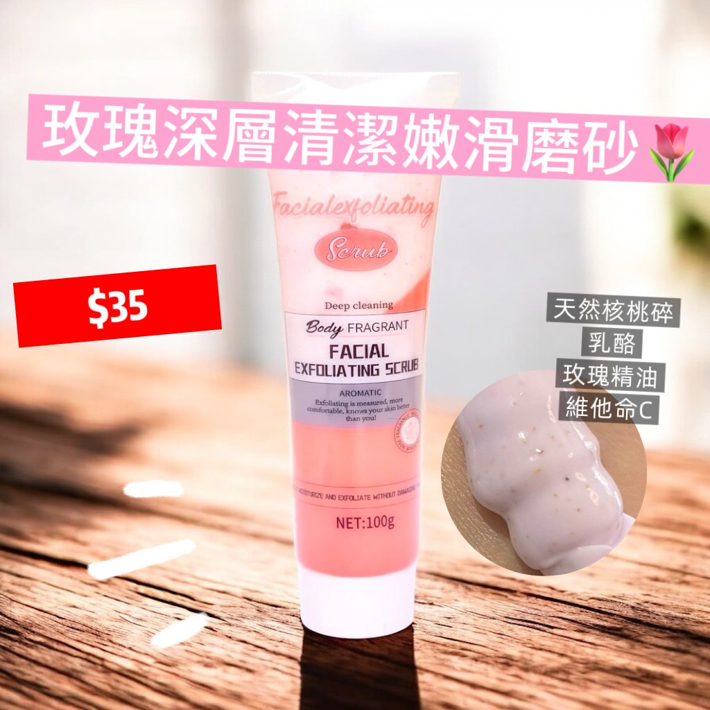 玫瑰深層清潔嫩滑磨砂 100g 含100%天然核桃碎、乳酪、玫瑰精油、維他命C,面部及身體均適用,清潔同時達到滋潤光滑的雙重功效 可潤澤肌膚及去除老廢角質,改善皮膚暗沉 使用過後肌膚光滑柔軟 🚩使用方法: 沾濕皮膚後,以打圈方式,將磨砂膏輕輕按摩,再以清水沖洗乾淨。每週使用 1至2 次以達至最佳效果 💚不含微塑膠 💰$35一支