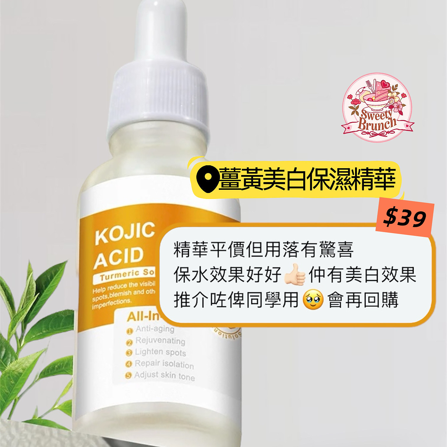 薑黃美白保濕精華 30ml 💁🏻♀️面部身體均適用,可淡化手踭、膝頭色素沉澱 💛有效去黑斑美白 💛修護抗衰老 💛淡化細紋皺紋 💛緊致肌膚、保濕 主成份: 薑黃-舒緩發紅並鎮靜敏感肌膚,減少色素沉澱,延緩皮膚衰老進程 曲酸-抑制導致皮膚色素沉著的酪氨酸酶 💰$39(30ml)