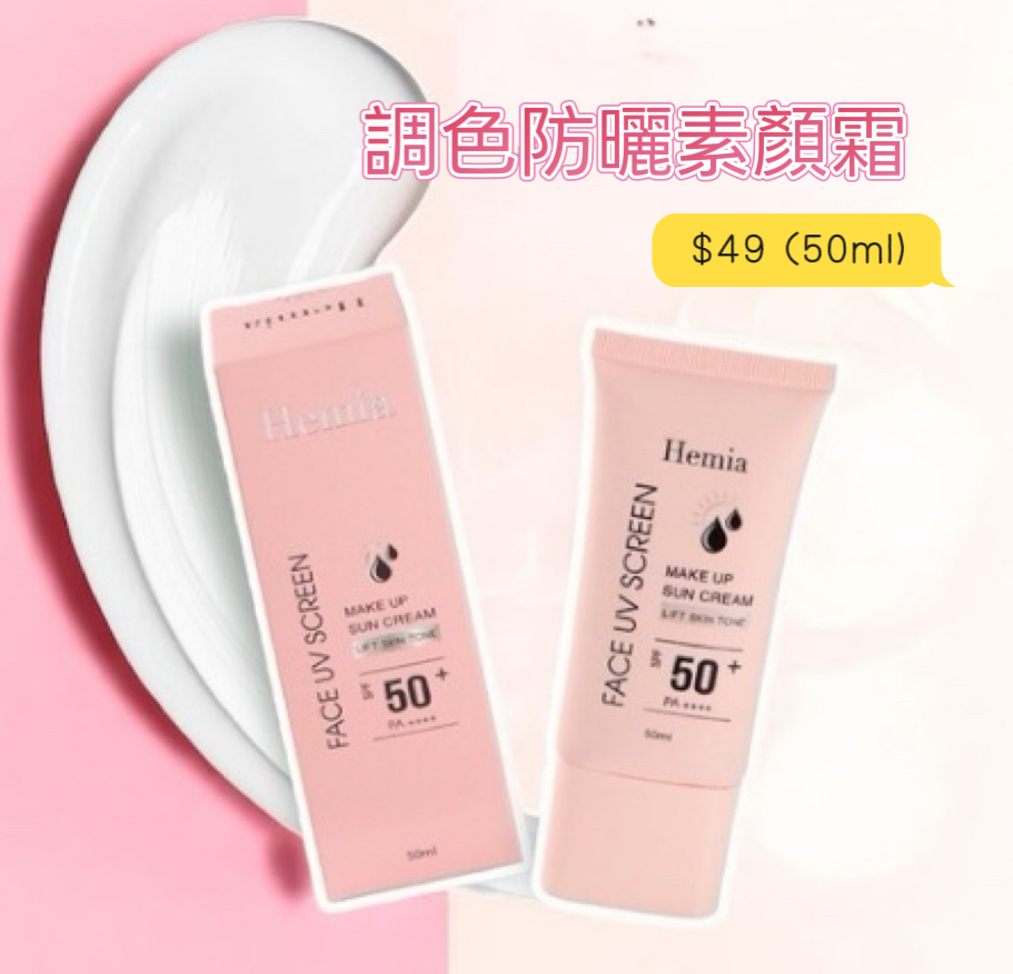 Hemia Face UV 調色防曬素顏霜 是一款具有防曬功能的素顏霜(調色隔離霜) 提供SPF 50+ 及PA++++ 的高強度防曬保護。 可用作素顏霜或妝前打底霜 具有提亮膚色及潤色功能,質地輕盈不油膩 屬於物理性防曬,對敏感肌膚較溫和 結合了防曬乳和潤色乳的功能,適合日常快速提亮膚色並提供足夠紫外線防護 💰$49(50ml) EXP: 20261226