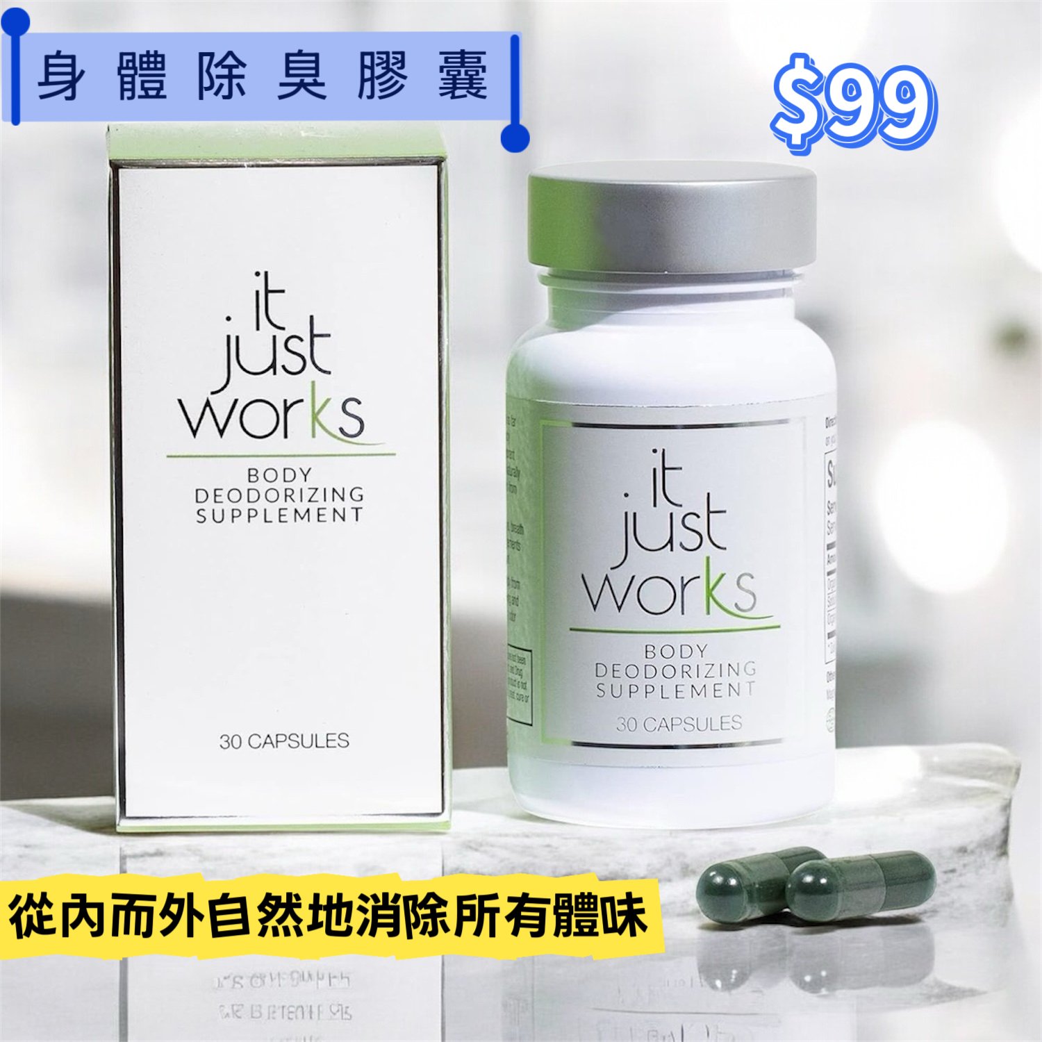 🇺🇸It Just Works Whole Body Natural Deodorizing Supplement 身體除臭膠囊 30capsules 💁🏻♀️從內而外自然地消除所有體味,讓您從頭到腳、從內到外全身清新 ❌從根源解決狐臭、汗臭、腳臭都讓人難以忍受 從體內除臭補充劑能從源頭消除體味。 特別推薦給少吃蔬菜水果者、愛吃味道濃烈的食物、習慣熬夜、有抽菸習慣、有狐臭/汗臭/體臭/口臭/腳臭等困擾的人士 獨特配方,由內淨化異味,4-8週就可告別異味 💰$99