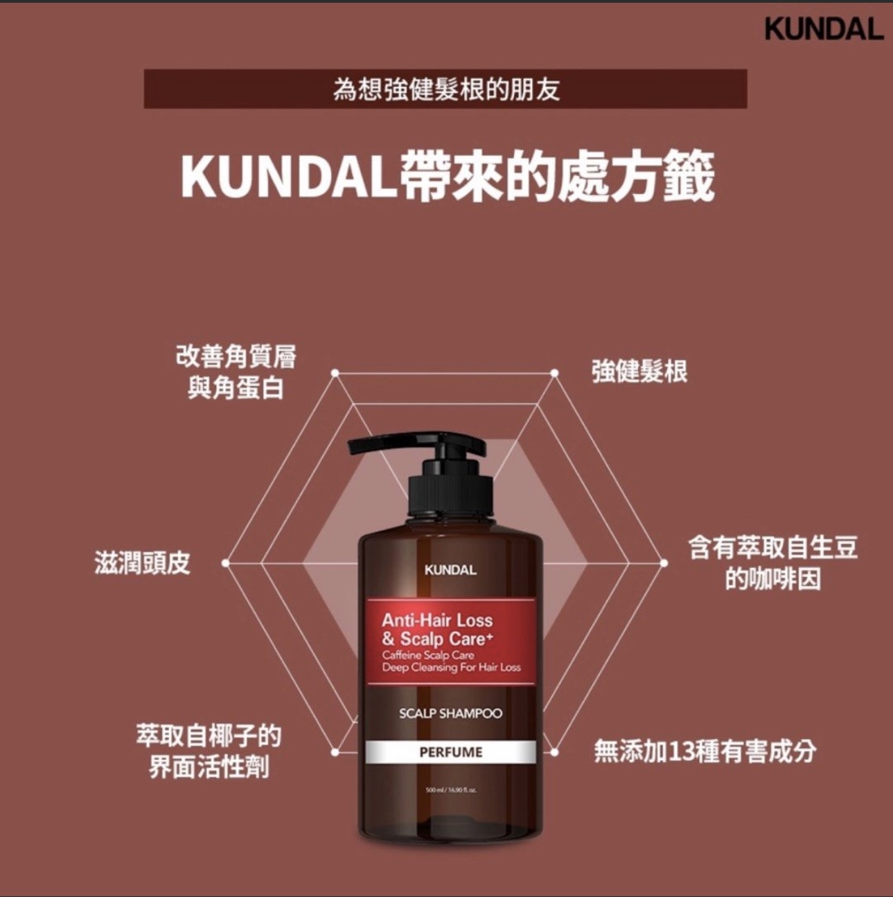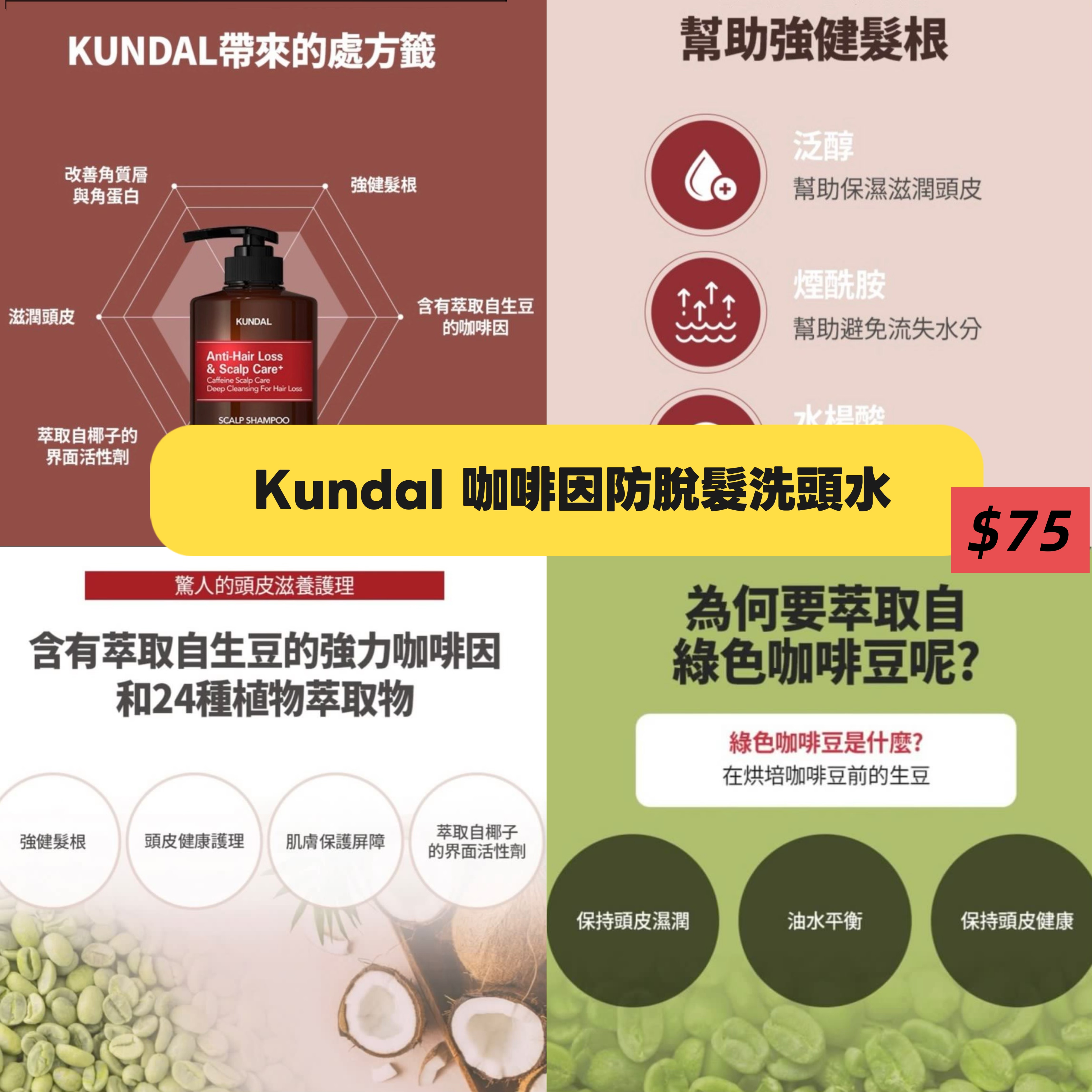 Kundal 咖啡因防脫髮洗頭水 500ml 💁🏻♀️轉季打造健康頭皮 ☕️3種核心成分,打造強健有力的頭皮 ☕️洗淨油脂及老廢角質 ☕️內含泛醇、薄荷醇與水楊酸,協助減緩無力頭皮 ☕️內含萃取自生豆的咖啡因,提供頭皮營養 ☕️椰子萃取植物性潔淨成分,天然安心 ☕️無添加13種有害成分,認證完成 [使用方法]取適量起泡後由髮尾按摩至髮根及頭皮再以溫水 💰75 (500ml)