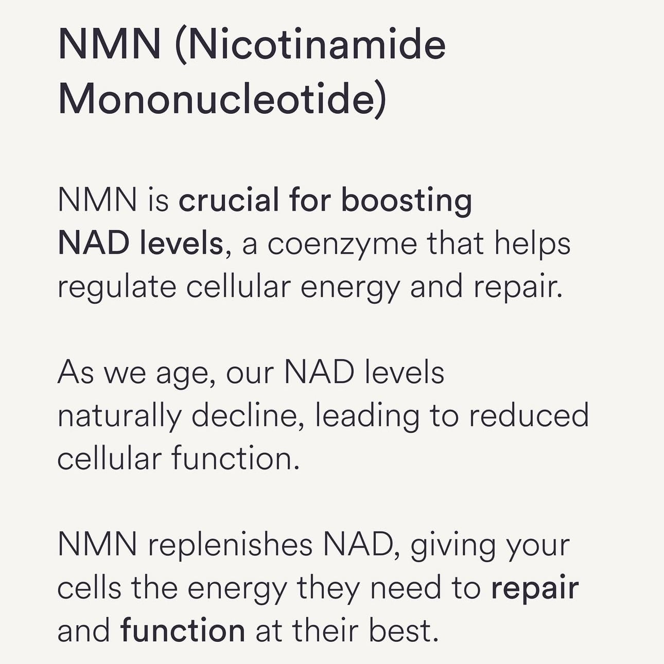 N A D + 是一種存在於所有活細胞中的輔酶,負責能量轉換、DNA修復和細胞代謝,維持細胞活力和功能