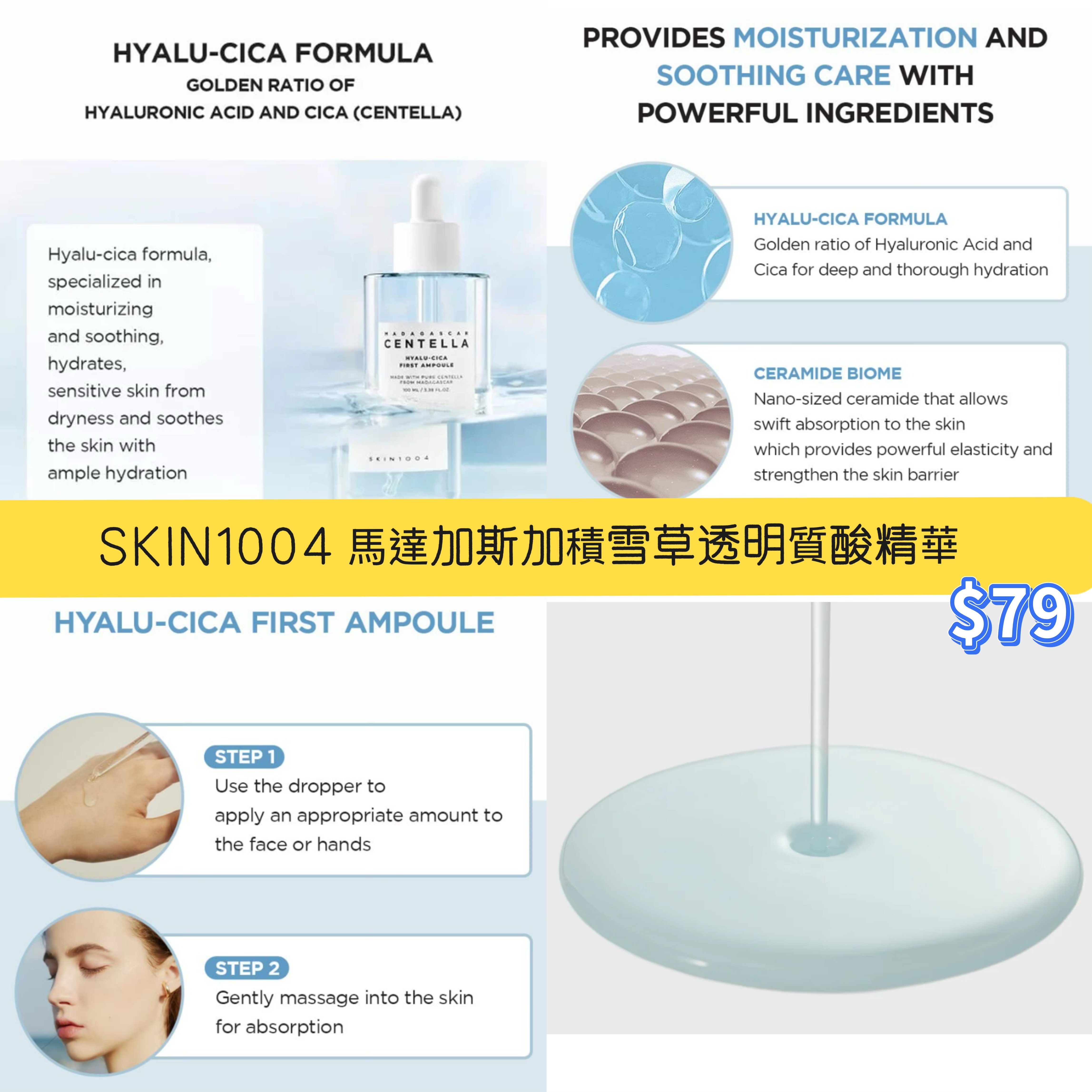 SKIN1004 馬達加斯加積雪草透明質酸CICA初榨精華 100ml 💁🏻♀️這款多功能精華專為提供深層保濕而設,讓肌膚時刻保持水潤與舒緩,告別乾燥與不適! 深層保濕: 提供長時間的水潤感,讓肌膚恢復健康光澤 積雪草提取物: 富含積雪草及其他植物提取物,加強肌膚屏障 最佳使用時機: 可在清潔後立即使用,以達到最佳效果 🚩使用方法: 清潔和調理肌膚後,取適量精華。 均勻塗抹於肌膚上,輕輕按摩,幫助吸收。 💰$79一支