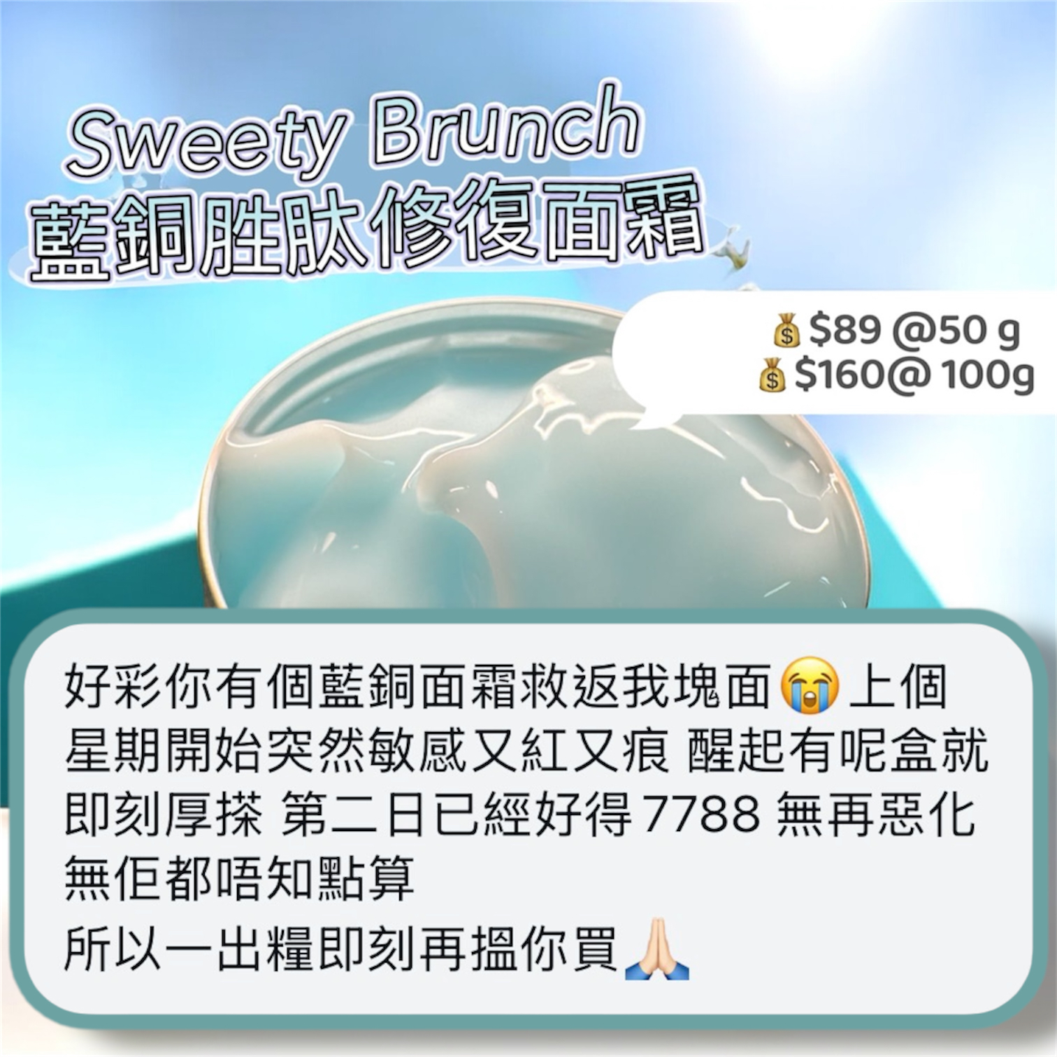 🆕Sweety Brunch 藍銅胜肽修復面霜 💁♀️適合改善敏感乾燥肌,轉季必備,脫皮急救❣️ ❣️藍銅胜肽是人體皮膚受創時產生的天然生長因子,能修復皮膚組織,促進新陳代謝,其分子極細,易於吸收,可直達肌底層 ❣️能有促進細胞更新,改善皮膚活力和生長能力 ❣️促進膠原蛋白和彈力蛋白生成,使皮膚更飽滿有彈性,減少乾紋和皺紋 ❣️促進透明質酸合成,增加皮膚鎖水能力 ❣️對抗發炎反應,舒緩皮膚急性狀況,如泛紅、甩皮 ❣️增強細胞抗自由基功能 ❣️改善整體膚質和厚度,不但使肌膚緊緻有彈性,更帶來極佳的淨度和透明感 💁🏼♀️連續使用28天後,表皮的更新速度,會大大提升 💰$89 @50g 💰$160@ 100g 🆕 Sweety Brunch Copper Peptide Regenerating Gel Cream 💁♀️ Suitable for improving sensitive dry skin, an essential during seasonal changes, and a remedy for flaking ❣️ ❣️ Blue copper peptides are natural growth factors produced by the skin in response to injury, capable of repairing skin tissue and promoting metabolism. Their extremely fine molecules are easily absorbed, reaching the deeper layers of the skin. ❣️ Promotes cell renewal, enhancing skin vitality and growth ability. ❣️ Stimulates the production of collagen and elastin, making the skin more plump and elastic, while reducing fine lines and wrinkles. ❣️ Promotes the synthesis of hyaluronic acid, increasing the skin's moisture retention capacity. ❣️ Fights inflammatory responses, soothing acute skin conditions such as redness and peeling. ❣️ Enhances the cells' ability to combat free radicals. ❣️ Improves overall skin texture and thickness, not only tightening and increasing elasticity but also providing excellent clarity and transparency. 💁🏼♀️ After continuous use for 28 days, the rate of epidermal renewal will greatly increase. 💰 $89 for 50 g 💰 $160 for 100 g