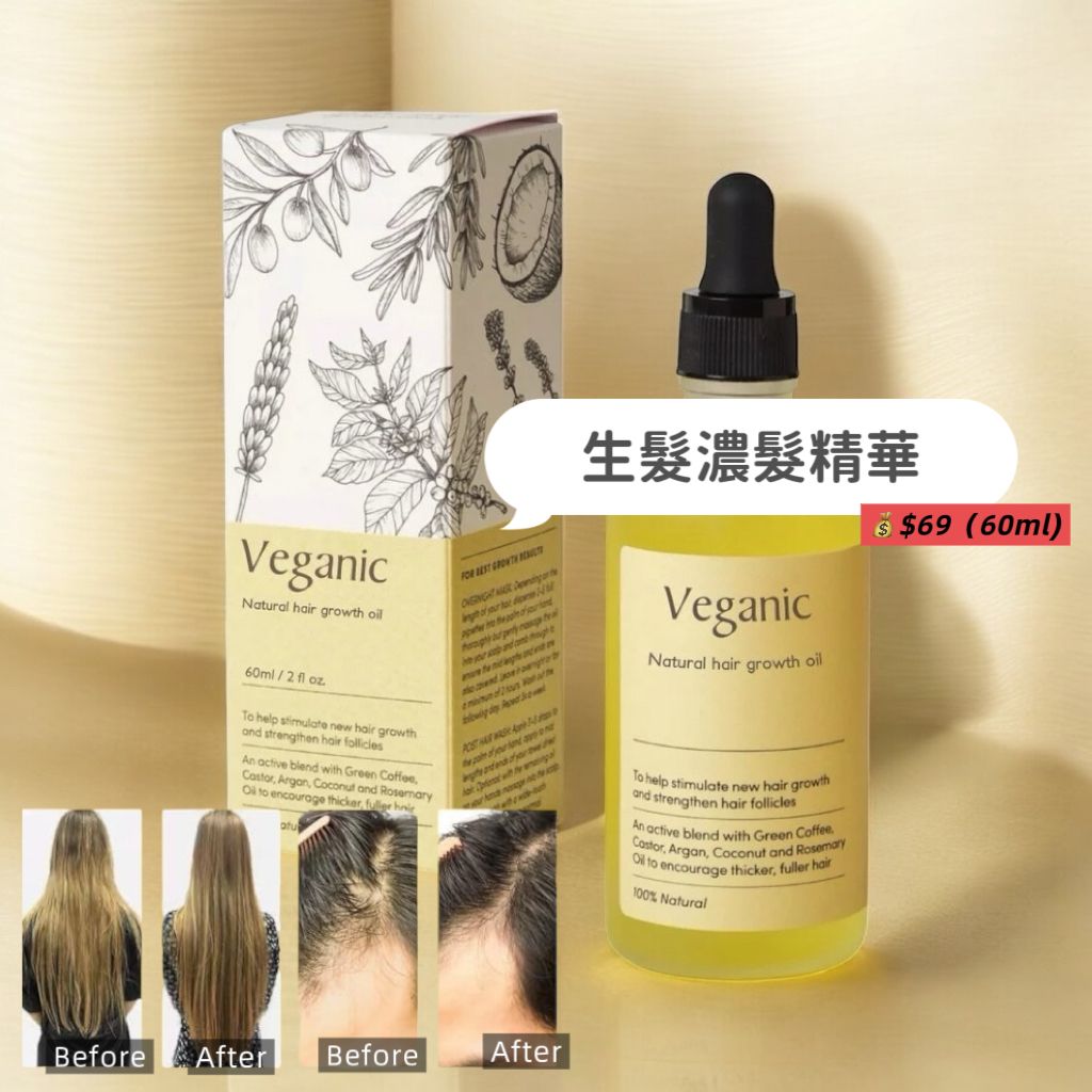 🍀Veganic生髮濃髮精華 針對脫髮、頭髮稀疏問題的頭皮護理產品,含有咖啡因及多種植物萃取,能強韌髮根、改善頭皮健康、促進生髮 天然漢洋配方,為毛囊頭髮提供養份,激活頭髮生長,有效抑制掉髮因子,強韌髮絲 🚩針對6大脫髮問題: -解決髮量稀薄 -掉髮增加 -容易折斷 -毛躁暗啞 -壓力脫髮 -產後脫髮 ✓適用於所有肌膚 ✓敏感肌適用 ✓孕婦可用 ✓純素產品 💰$69(60ml)